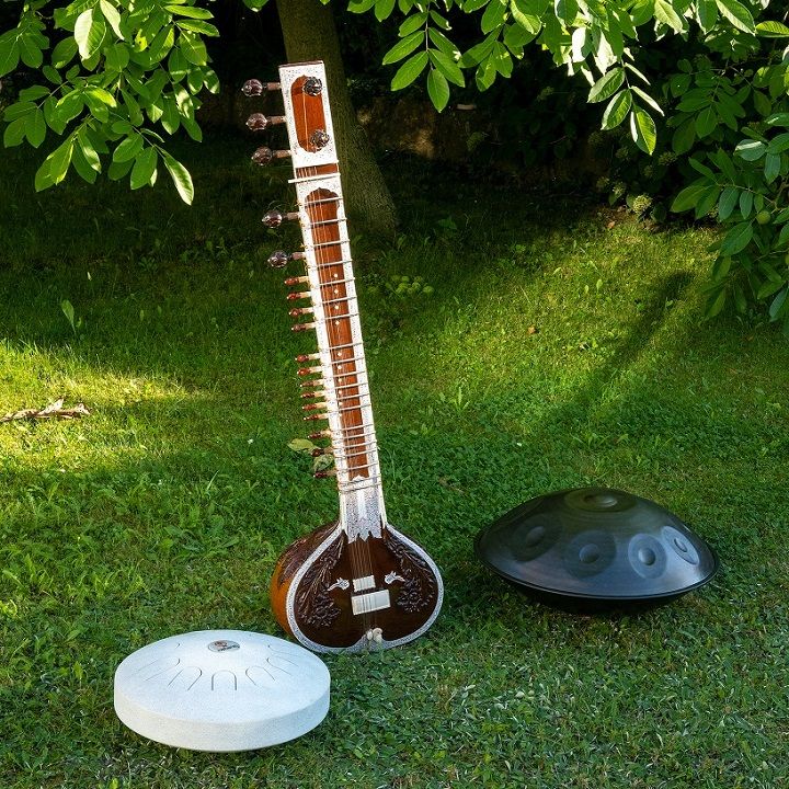 Indický Sitár Sundaris z Kalkaty s plastovým pouzdrem na kolečkách – tradiční ručně vyráběný hudební nástroj. Objevte kouzlo autentického indického Sitáru Sundaris, vyrobeného v Kalkatě – městě s dlouhou tradicí výroby hudebních nástrojů. Tento tradiční sitár je ručně zdoben jemnými ornamenty a bílými intarziemi. Charakteristický zvuk zajišťuje velká ozvučná tykev, kvalitní kobylka a tělo z kombinace teakového, smrkového a mangového dřeva. Sitár má 6 hlavních melodických a 12 rezonančních strun, které vytvářejí bohatý, hypnotizující tón typický pro klasickou indickou hudbu. Délka nástroje je 118 cm. Součástí balení je odolné plastové karbonové pouzdro na kolečkách, které chrání nástroj při přenášení i skladování.