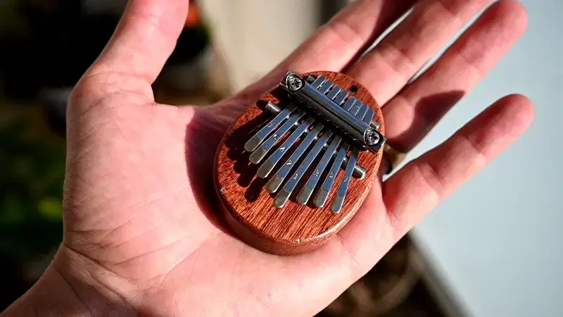 Kalimba Mini 8 tónová s rozsahem 1 oktávy. Kovové rezonátory jsou připevněné na oválnou dřevěnou desku o délce 5 cm. Tuto Kalimbu lze zavěsit i pomocí provázku jako ozdobu, nebo přívěsek na klíče.